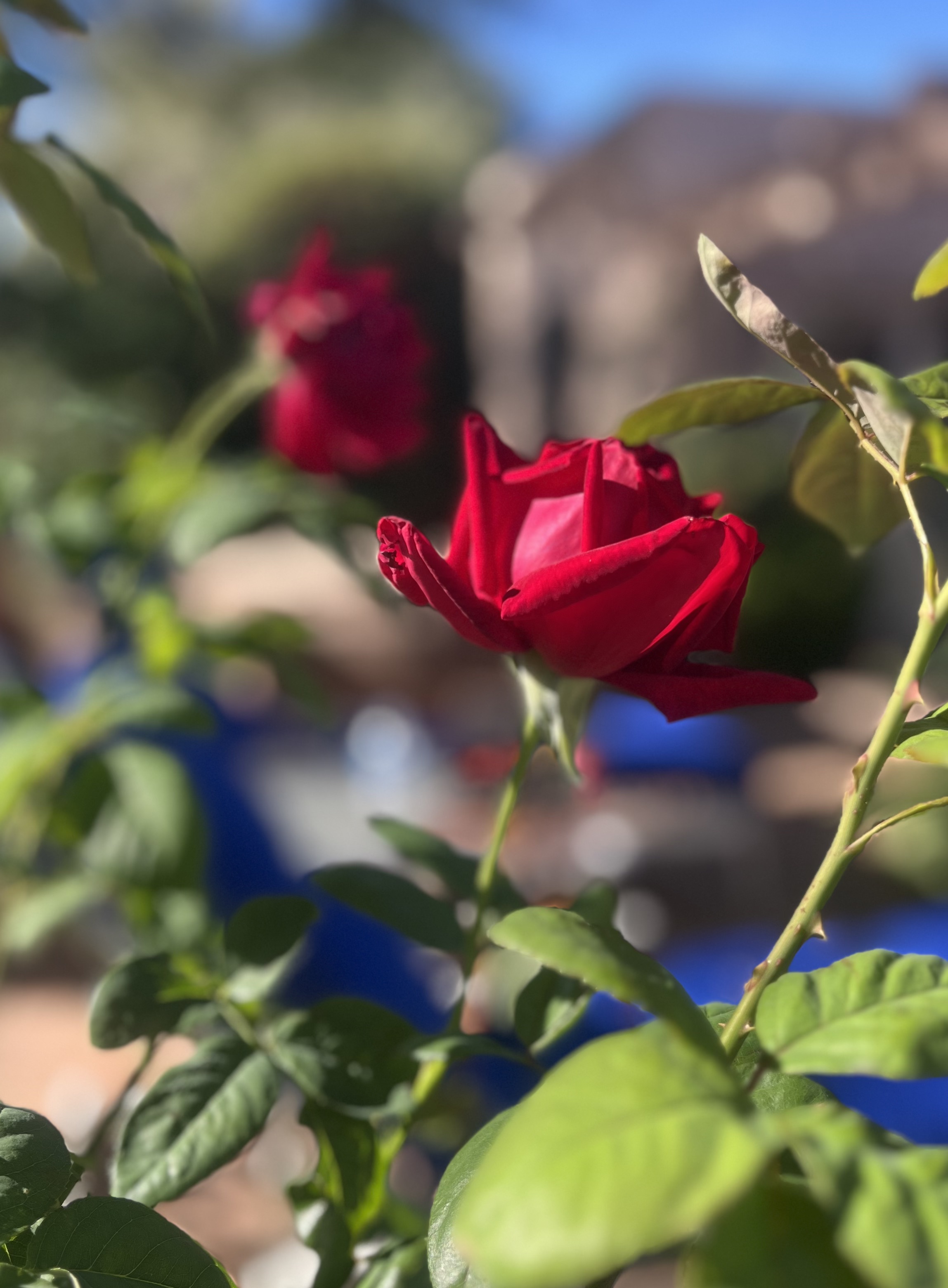 I am sitting on their patio by an old red rose with a thick stump of a stem, the size of my wrist. Its five red velvet blooms dance a little in the breeze releasing a fragrance so beautiful it nearly breaks your heart. I keep breathing deep, trying to catch it.